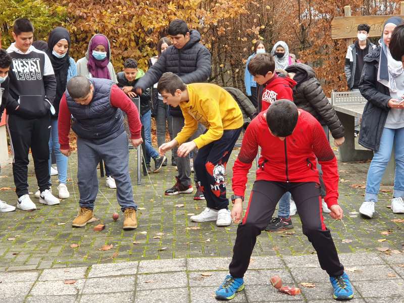 Im Unterricht setzten sich Schüler und Schülerinnen der IK mit dem Thema "Herbst und Halloween" auseinander. Den Abschluss bildete die "Die lustige Herbstolympiade". 27 Schüler und Schülerinnen aus 8 Nationen, mit unterschiedlichen Sprachkenntnissen, "mussten" sich in gemischten Teams sprachlich verständigen, auf Regeln einigen und dabei fair und rücksichtsvoll miteinander agieren. Insbesondere die Staffelspiele verlangten von allen eine besondere Zusammenarbeit und Fairness, egal welcher/n Herkunft, Alters, Religion, Geschlechts...